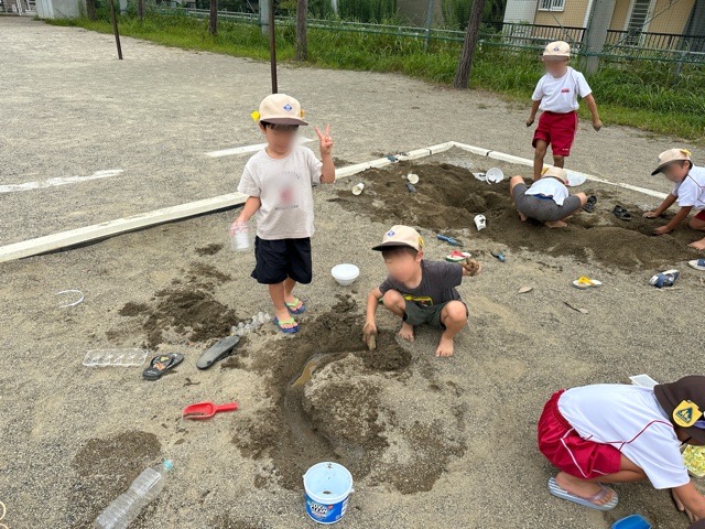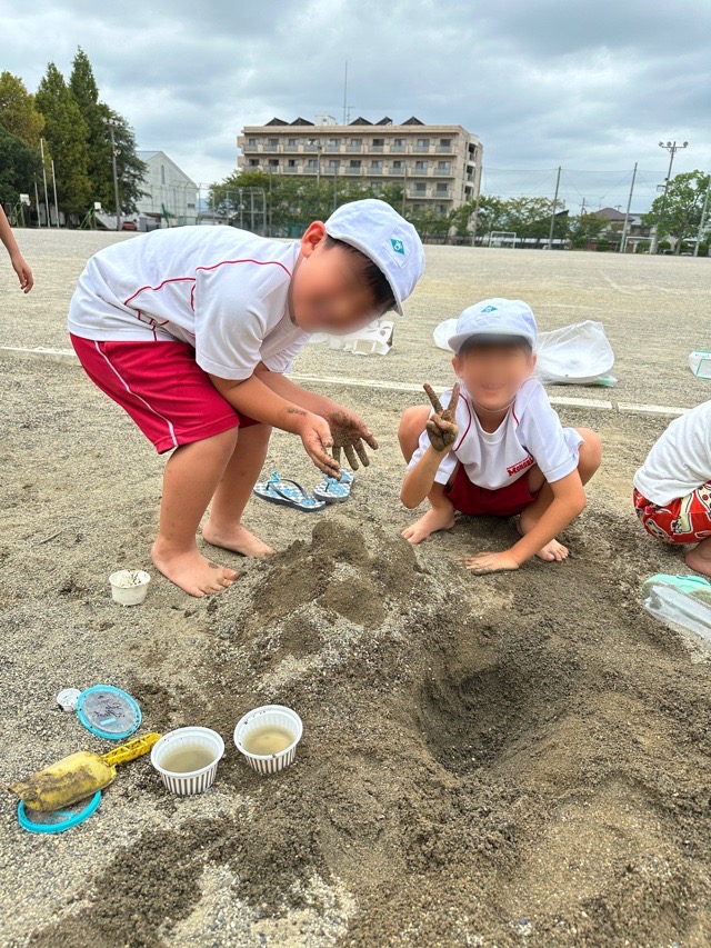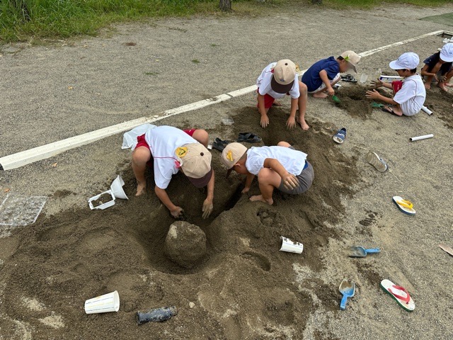 1年生が、生活科の学習で砂遊びをしました。仲間と協力しながら、穴を掘ったり山を作ったりと思い思いに楽しむ子どもたち。トンネルや水路を作って水を流す子もいます。いつの間にか履いていったサンダルも脱ぎ、足裏で砂の心地よい感触を味わいながら、精一杯楽しむ姿が見られました。