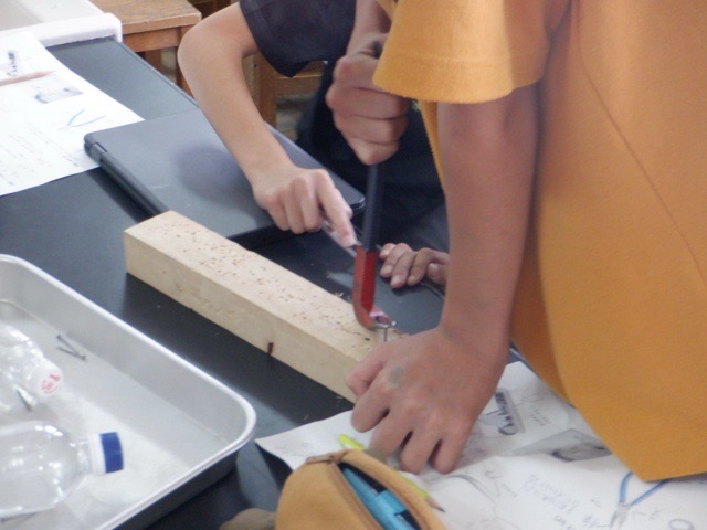 理科室の前を通ると、何やらトントンとくぎを打つ音が聞こえてきます。「なぜ理科室で図工を?」と不思議に思い覗いてみると、6年生が「てこ」について学んでいました。くぎ抜きやペンチ、実験用の装置を使いながら実験に取り組む子どもたち。身近な道具を使いながら「てこ」の原理について学ぶ姿が、たくさん見られました。