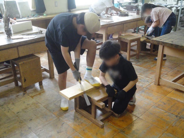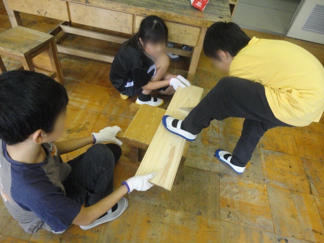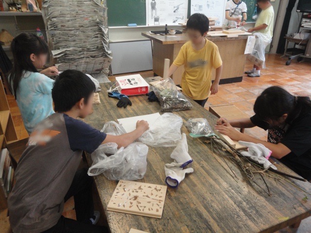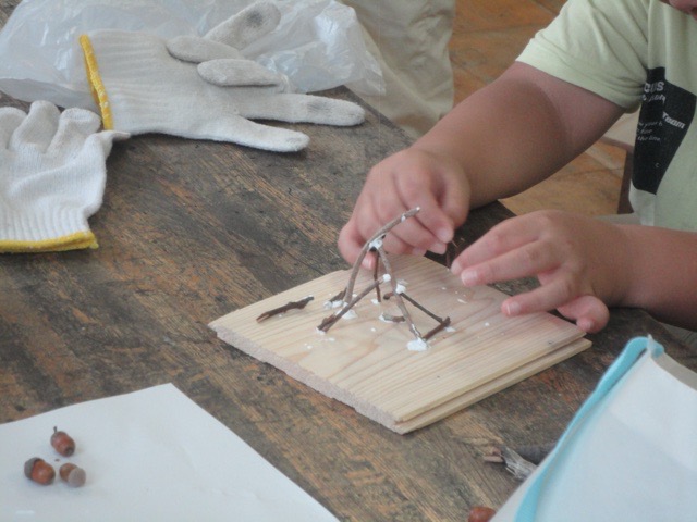 4年生が、「ひみつのすみか」を作成しています。まずはのこぎりを使って、長い板から土台を必要なだけ切り出します。ここでは協力が大事。板が動かないよう、友だちにしっかりと押さえてもらってギコギコギコギコ・・・「切れた!」と嬉しそうな声があがっていました。切り出した土台に、中庭や公園などで拾ってきた小枝や落ち葉、木の実を並べてみたり、立ててみたり、斜めにして組んでみたり、浮かんだアイディアをいろいろ試しながら、楽しい「ひみつのすみか」が広がっていきます。どんなすみかが出来上がるのか、楽しみです。