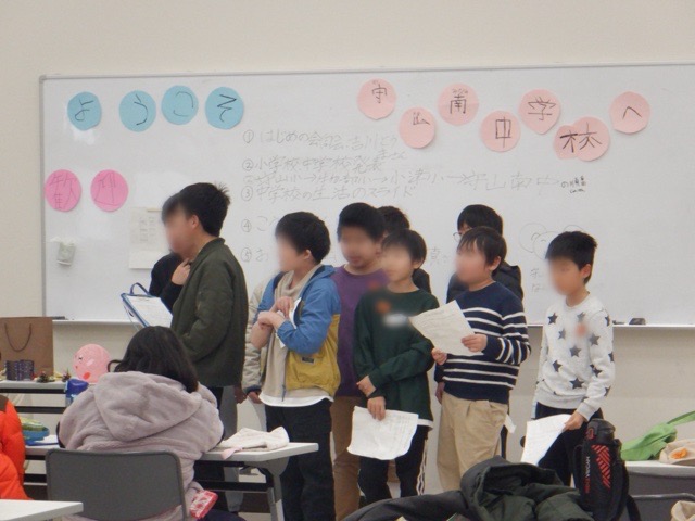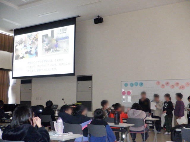 守山南中学校区特別支援学級の子どもたちが、守山南中学校に集まって交流会を開きました。まずはそれぞれの学校の取組をスライドなどを使って発表します。少し緊張の面持ちでしたが、練習のかいあって自分たちの取組をしっかり伝えた子どもたち。その後は、中学校の生活をスライドで紹介してもらったり、校舎の中を案内してもらったりと、有意義な時間を過ごすことができました。