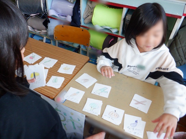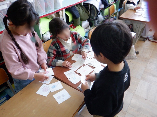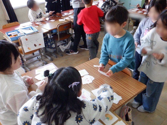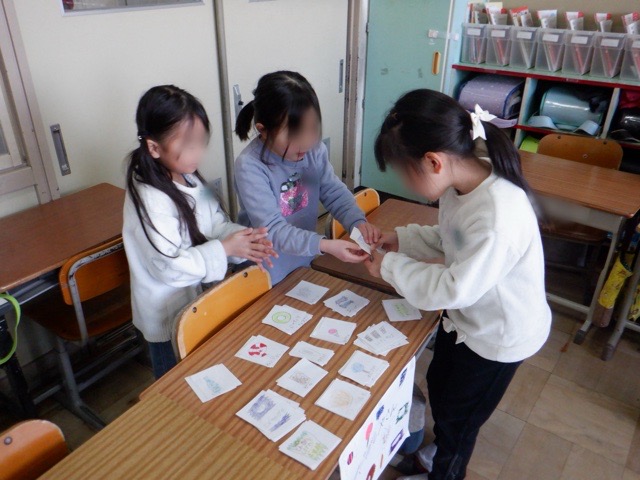 1年生が、国語科「ものの名前」で学んだことを活かして、お店屋さんを開きました。駄菓子屋や果物屋など思い思いの店を開き、そこで販売されている品物を描いて販売します。店員役とお客さん役に分かれ、楽しく会話しながら学びを深めることができました。