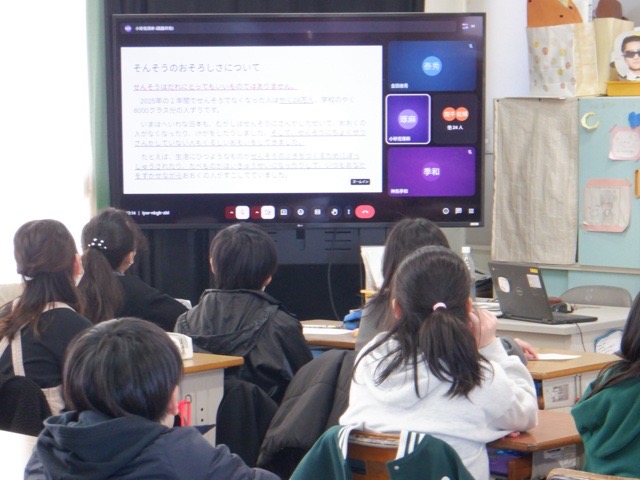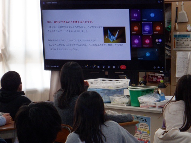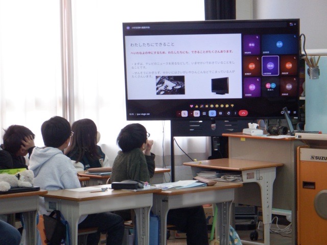 2月の人権の日は、「平和」をテーマに学びました。修学旅行で戦争の悲惨さを感じてきた6年生の代表児童が、全校に向けて平和な世界を築いていくことの大切さを発信。1~5年生は、各教室で6年生の発表を真剣に聞き入り、平和の大切さについて学びを深めました。