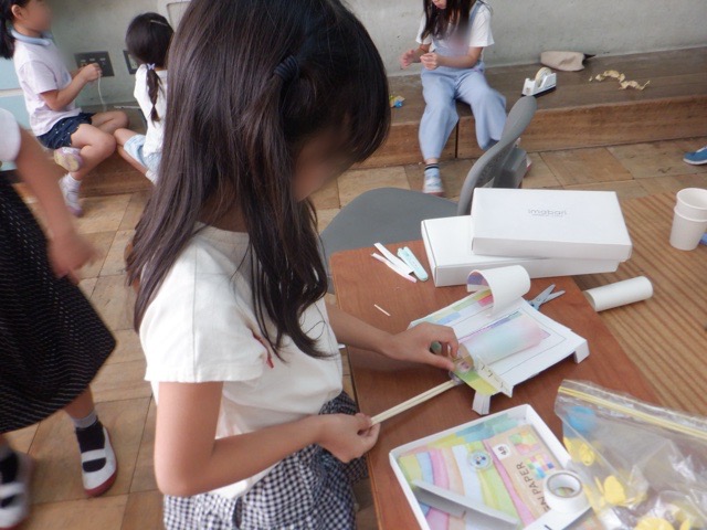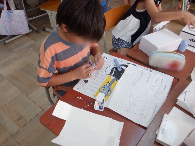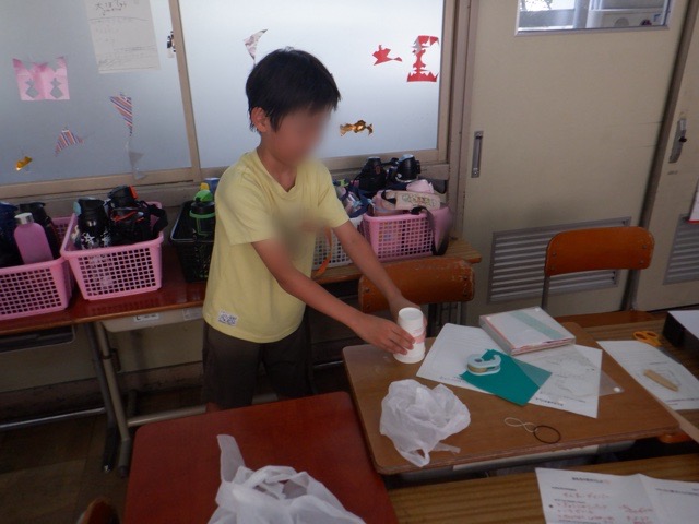 2年生が、1年生を招待することを目的に「動くおもちゃ作り」に取り組んでいます。それぞれが作ってみたいおもちゃの設計図を描き、紙コップや箱など思い思いの材料を用いておもちゃを作ります。空気の力や磁石、輪ゴムなどを利用しながら、どうすればうまくおもちゃが動いてくれるのか、いろいろと試行錯誤を重ねる子どもたち。その真剣なまなざしからは、「1年生に楽しんでもらうんだ!」という熱い思いが伝わってきます。どんなおもちゃが完成するのか、楽しみです。