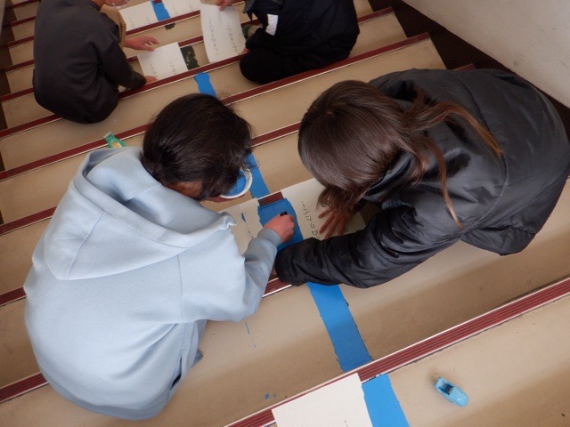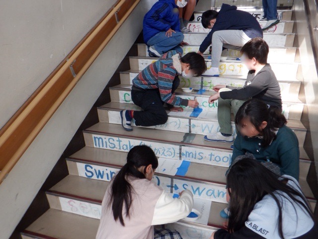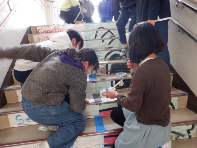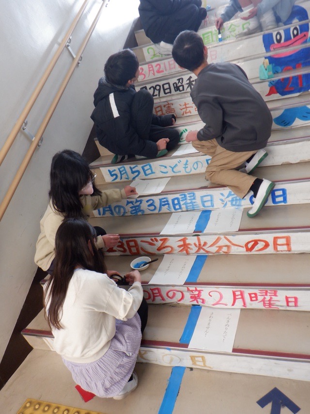 2月に入り、いよいよ「卒業」が迫ってきた6年生。今月から、卒業に向けていくつかのグループを結成して活動する「卒業プロジェクト」がスタートしました。この日はボランティアグループのメンバーが、階段の中央線をペンキで塗る活動を実施。はみ出してしまわないように気を付けながら、丁寧に中央線を引いてくれました。
