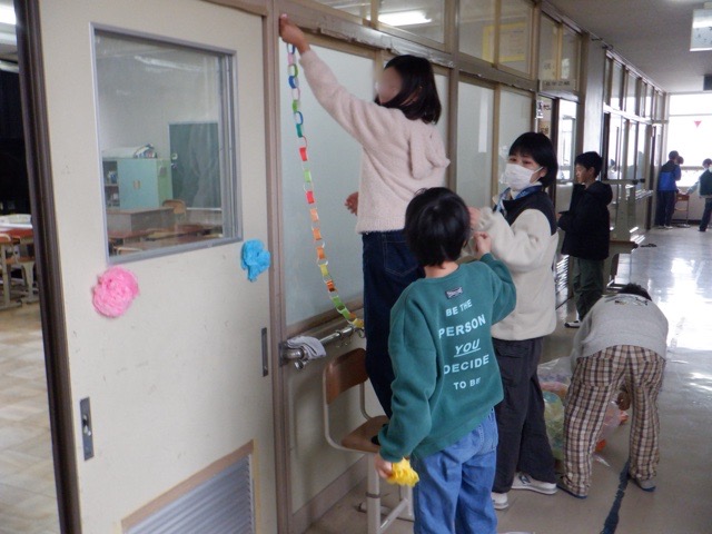 卒業式をいよいよ明日に控え、5年生が前日準備をしてくれました。会場を、教室を、そして校舎内をきれいに掃除し、飾りつけをしてくれる5年生。一生懸命取り組む姿からは、6年生に感謝の気持ちを伝えたいという思いとともに、次は自分たちが学校の中心になるんだという決意が、ひしひしと伝わってきました。