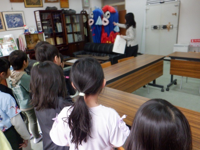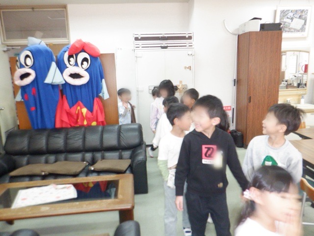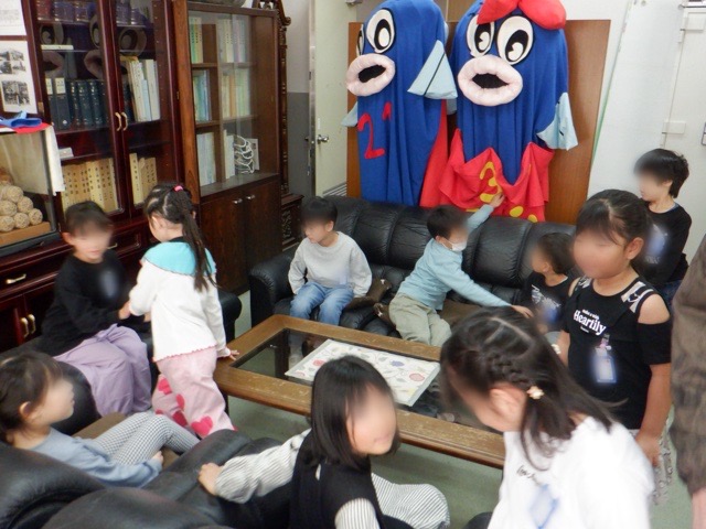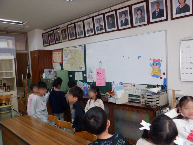 1年生が、学校探検で校長室を訪問。入学式で見た「ものべっこい」・「ものべっこちゃん」を見つけたり、校長室に掲示されている歴代校長の写真を眺めたりと、日頃なかなか入ることのできない校長室の様子に興味津々の子どもたちでした。