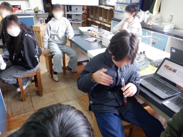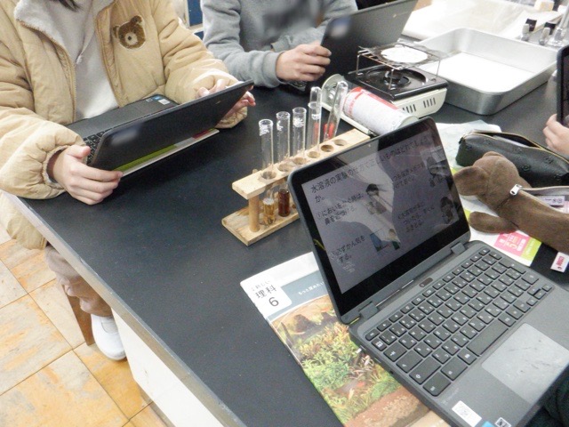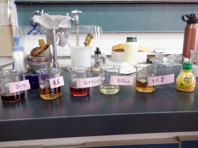 6年生が、これまでに学習した「水溶液」の性質の調べ方を活かして、身近な水溶液について調べました。洗剤や飲料など、家庭にあるものを使って、臭いをかいだりリトマス紙に付けたりします。予想外の反応を示す水溶液もあり、興味深く実験に取り組むことができました。