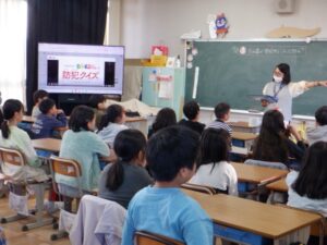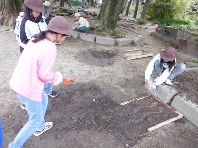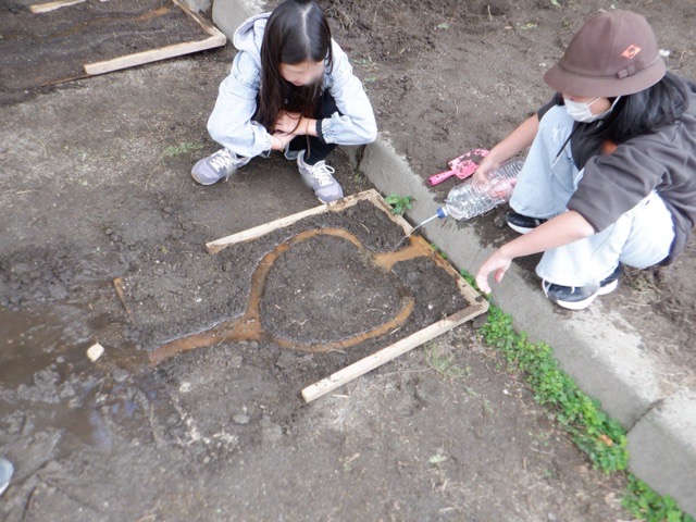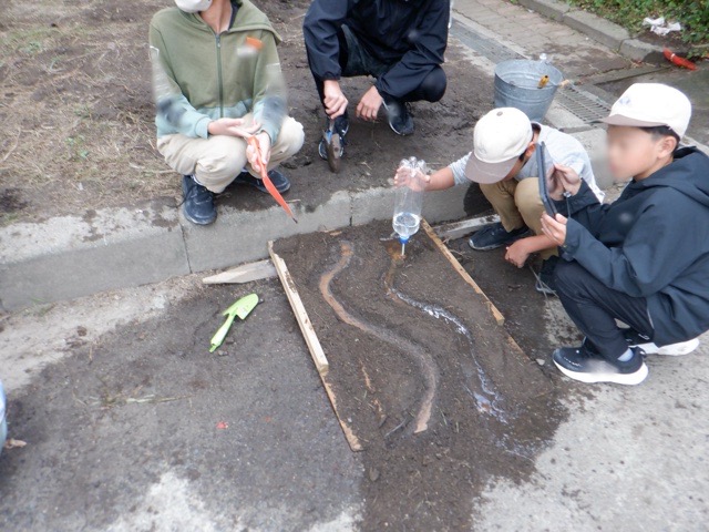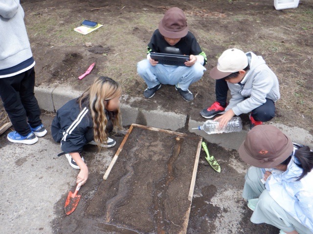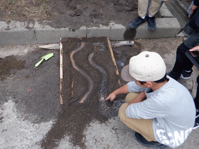 5年生が、校庭で「川」を作って水を流し、流れる水の働きを調べる実験をしました。実験の様子をタブレットで撮影し、水と一緒に流れる土の様子をじっくり観察。水のはたらきによって土が削られたり積もったりする様子を、しっかり学ぶことができました。
