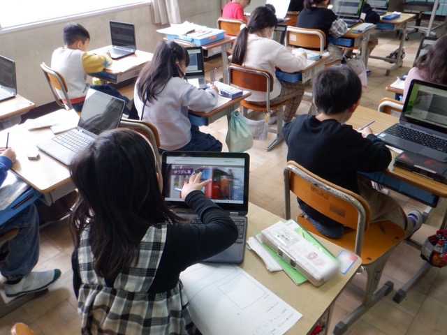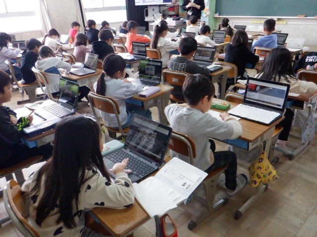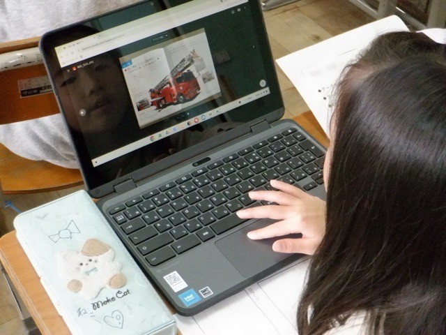 1年生が、タブレットを使いながらお気に入りの「自動車」について調べています。キッチンカーや救急車など、あらかじめ準備された自動車の中から自分のお気に入りを選び、その仕事や役割などをまとめていきます。タブレットを一生懸命操作しながら、プリントに考えをまとめる子どもたち。どんな図鑑が完成するのか、楽しみです。
