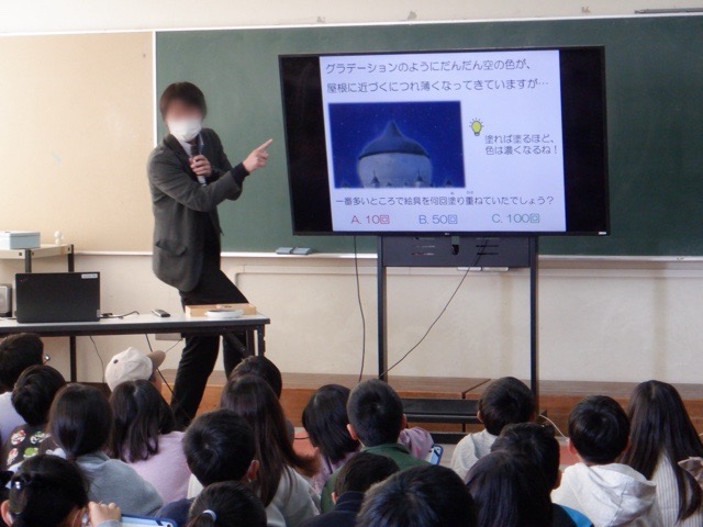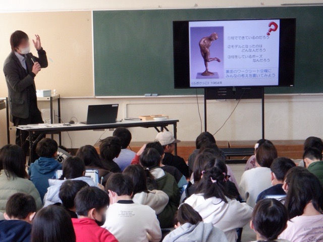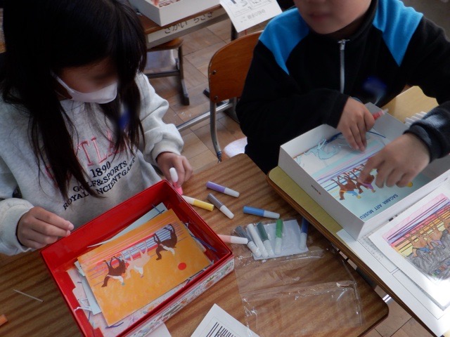 毎年佐川美術館にて実施している4年生の芸術体験教室。今年は、佐川美術館が休館中ということを受け、学芸員の方が学校にお越しくださり、芸術品に関する説明してくださいました。残念ながら実物を鑑賞することはできなかったのですが、現場よりもていねいに説明してくださったり、砂絵製作の時間がたっぷりあったりと、よい学びの時間となりました。