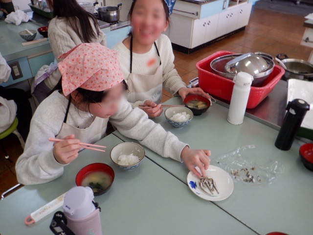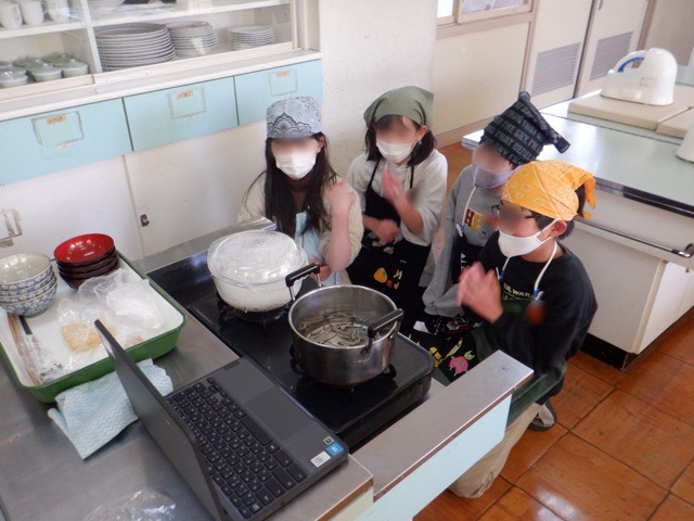 5年生が、家庭科の調理実習でご飯とみそ汁の調理に挑戦しました。日頃は炊飯器でご飯を炊く家庭も多いかと思いますが、今回の調理実習では、ガラス鍋にコメを入れ、ガスの火でご飯を炊きます。硬かったコメが水を吸収し、ふっくらとしたご飯になっていく過程をしっかり確認し、火加減をうまく調整しながらご飯を炊き上げました。煮干しから出汁を取った味噌汁も最高で、笑顔でおいしくいただきました。