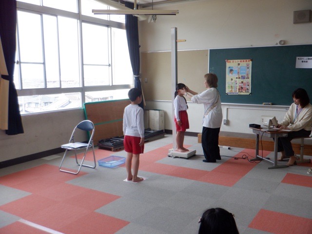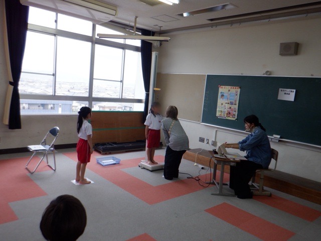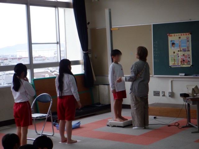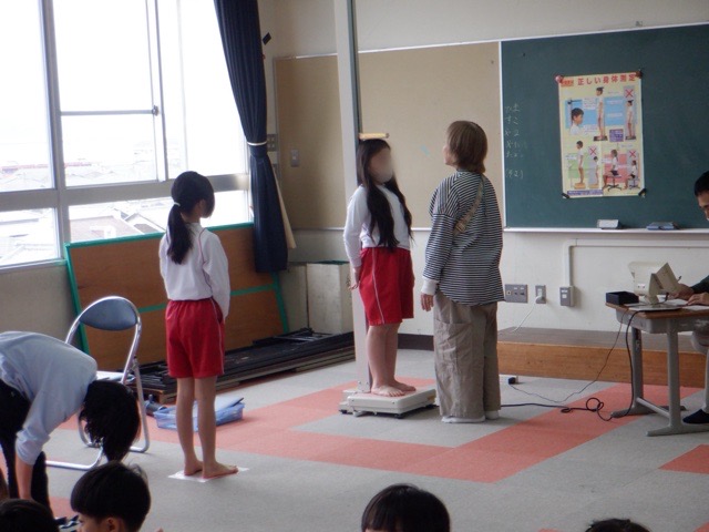 新学期になり、各学年の身体測定を実施しています。各クラス測定する教室へ移動し、養護教諭からの話を聞いた後は早速測定の開始です。この日で全学年の測定が終了したのですが、「大きくなったかな。」と少し緊張の面持ちで計測器にのる子どもたちの姿が印象的でした。