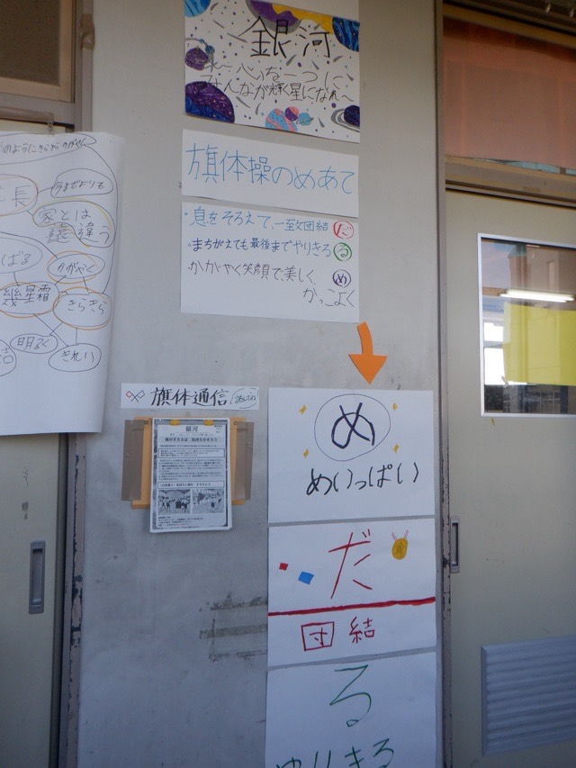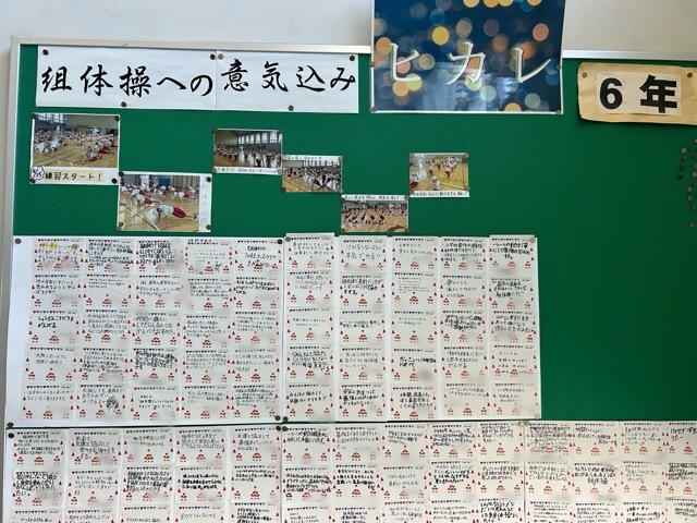 運動会の練習が始まって2週間。ちょうど折り返しの時期をむかえ、団体演技もずいぶん形が見えてきました。今週になり、運動場で練習する姿も増えてきています。また、校舎内には運動会に向けた子どもたちの思いが掲示されているコーナーも見られます。本番まで残り2週間を切りました。それぞれの思いが実現できるよう、一生懸命がんばる姿を支えていきます。