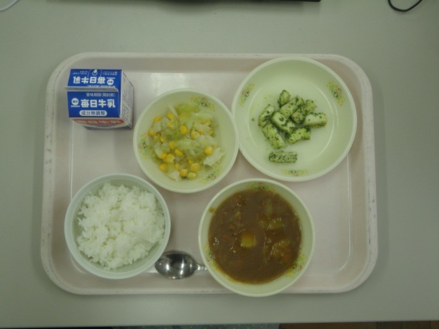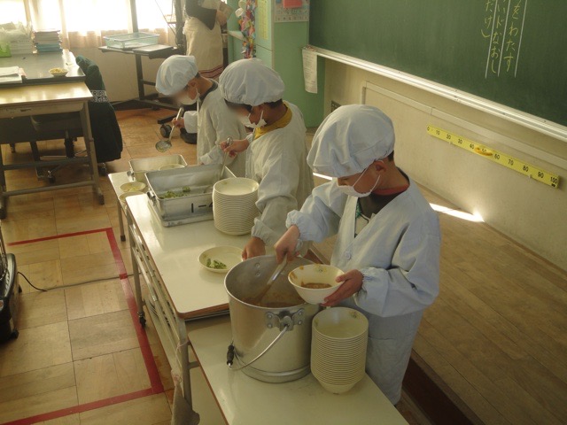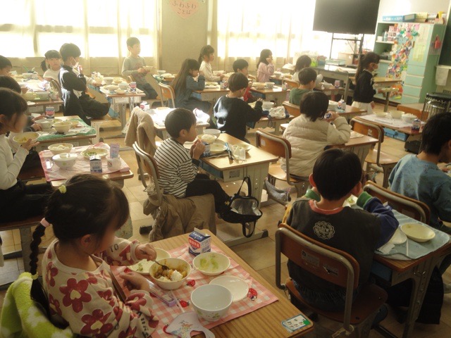今日は2学期最後の給食でした。献立は、ポークカレー、いかのバジル焼き、キャベツサラダ、ごはん、牛乳。ポークカレーは子どもたちが大好きなメニューのひとつで、いつもは残ってしまうごはんが空っぽになる学級もたくさんあったようです。1年生の給食準備の様子をのぞいてみると、すっかり手際がよくなり、給食当番さんが上手に配膳していました。準備ができたら、手を合わせて「いただきます!」。みんなで輪になって食べている教室もありました。給食室のみなさん、2学期も毎日おいしい給食をありがとうございました。