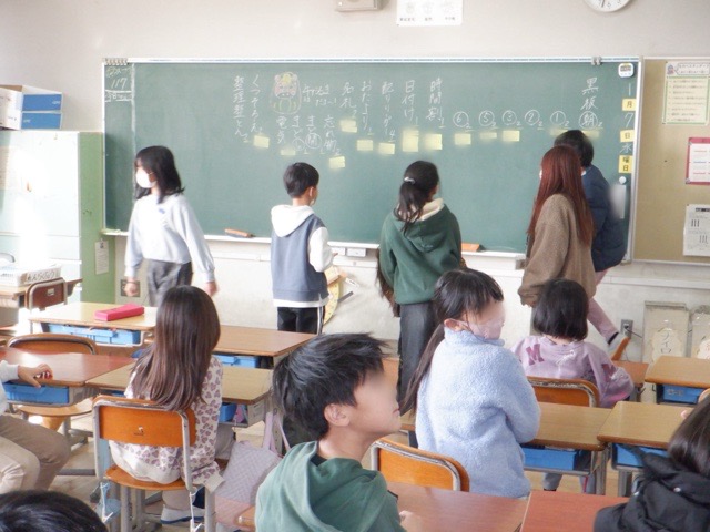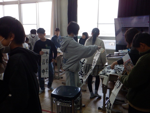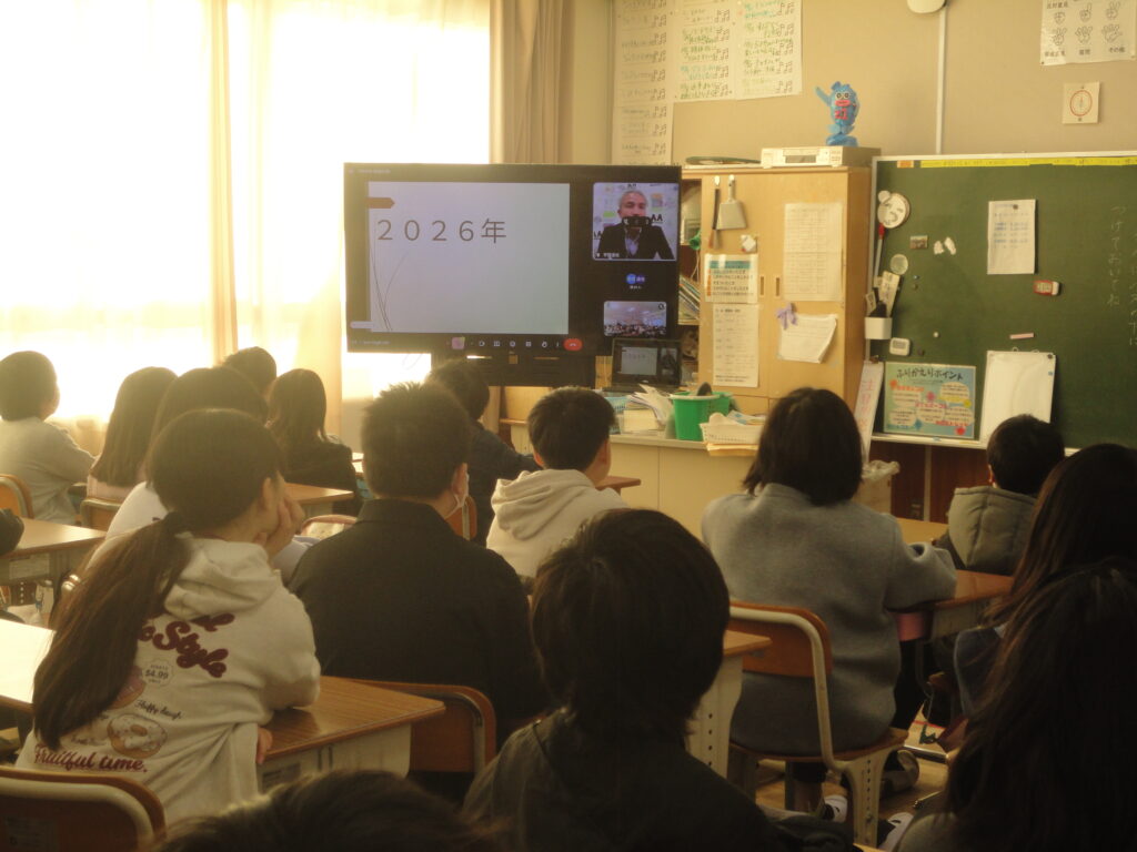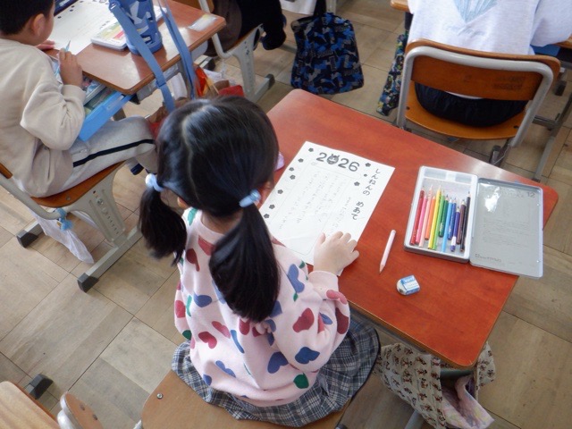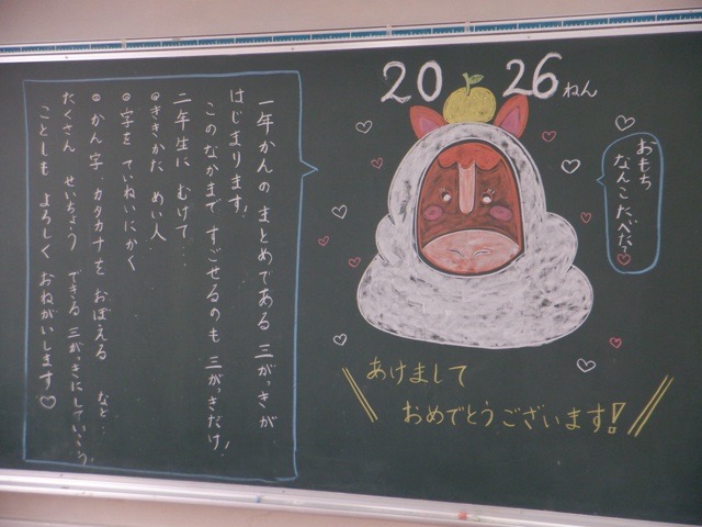 校歌の冒頭にある「比良の山なみ」が真っ白に覆われる寒い日となりましたが、子どもたちの元気な声が学校に戻ってきました。始業式は今回もオンラインでしたが、配信をしている校長室まで子どもたちの元気なあいさつの声が聞こえてきます。始業式の後は、2026年の目標を立てたり、すごろくをして遊んだりと、新年らしい姿が多くのクラスで見られました。