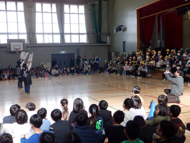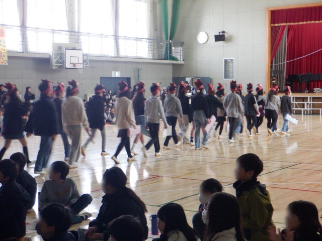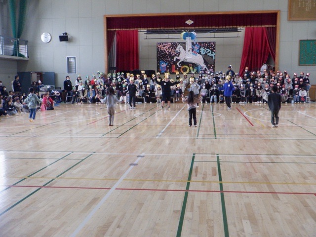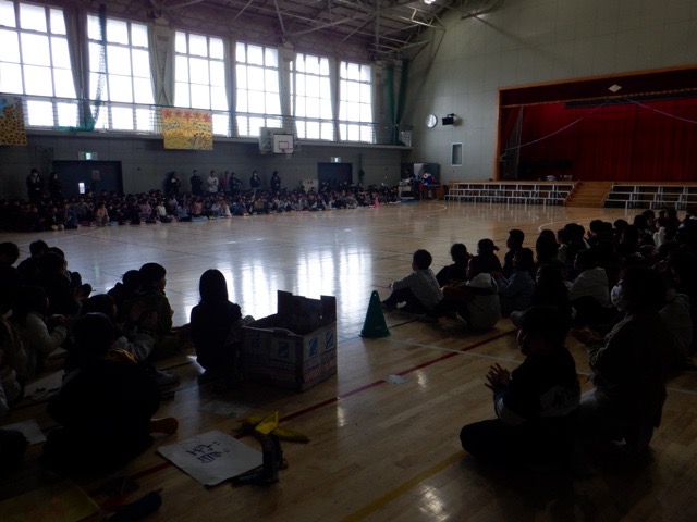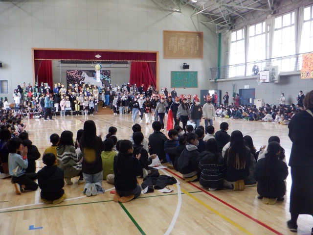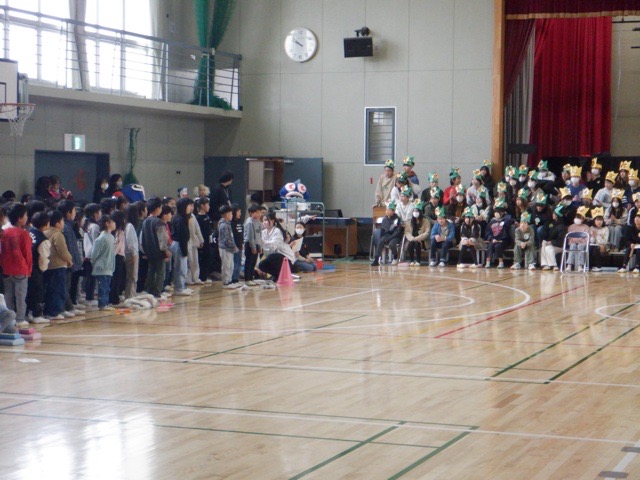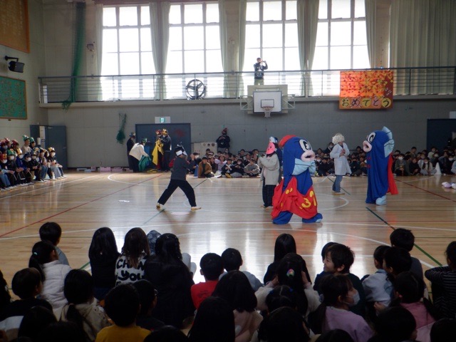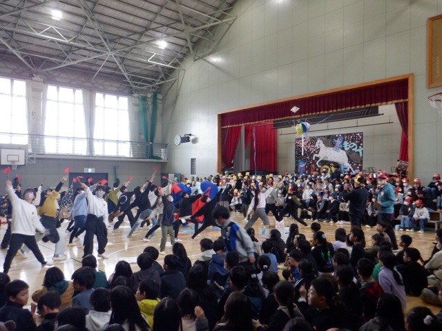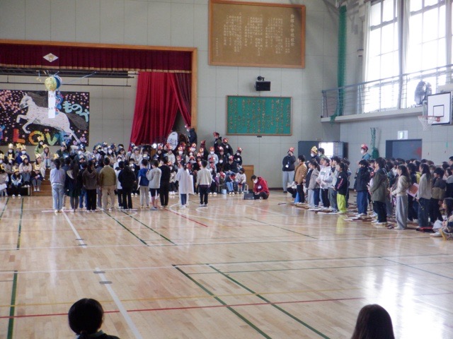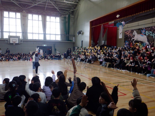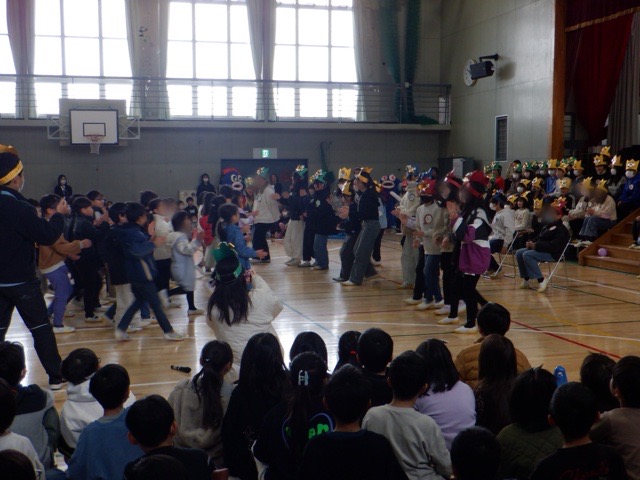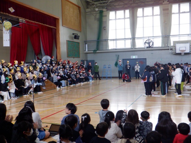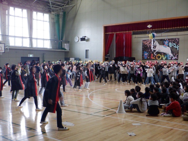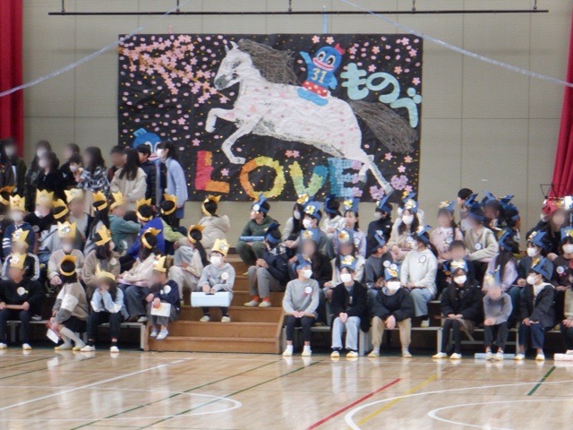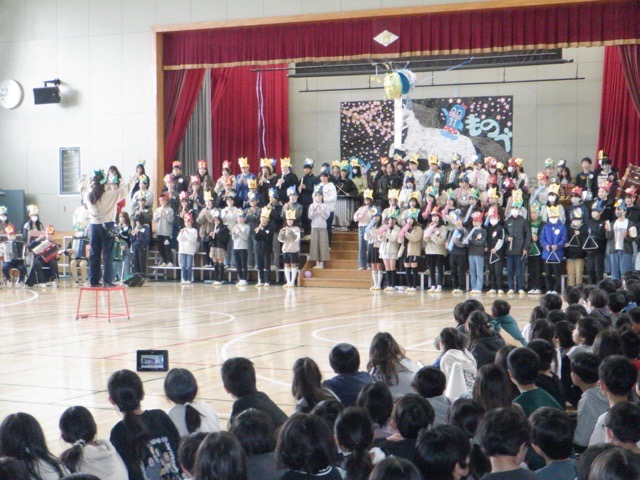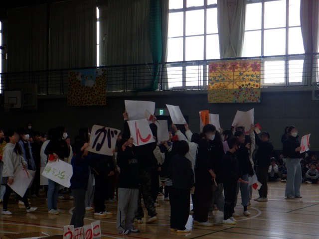 今日は6年生を送る会。これまでの感謝の気持ちを6年生に伝える日です。「サンキュー・グッバイ6年生」を合言葉に、それぞれの学年から6年生にありがとうの気持ちを精一杯伝えます。クイズあり、一緒にダンスあり、6年生との対決ありと、趣向を凝らした出し物で6年生に楽しんでもらおうとがんばる在校生たち。特に5年生は、企画・準備・運営と次の物部小のリーダーとして精一杯がんばってくれました。5年生のがんばりのおかげで、6年生も終始穏やかな表情で在校生とのひと時を楽しんでいました。
